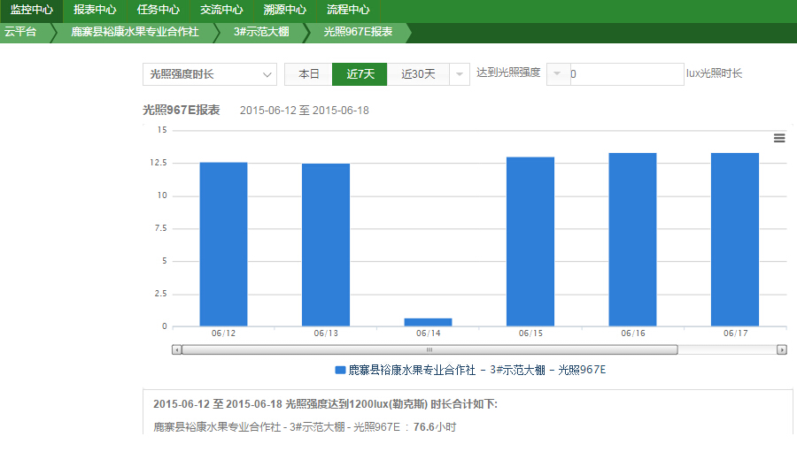 天潤智力智能農(nóng)業(yè)云平臺可以全面監(jiān)測葡萄所受的光照強(qiáng)度,以此來判斷是否需要進(jìn)行人工補(bǔ)光以及人工補(bǔ)光的強(qiáng)度。進(jìn)而保證葡萄的品質(zhì)。