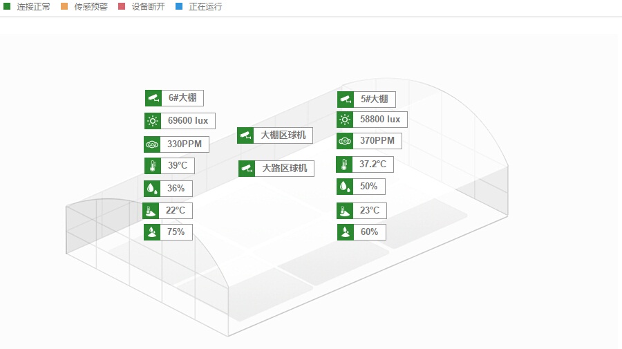 利用土壤溫度傳感器、土壤濕度傳感器、空氣溫度傳感器、空氣濕度傳感器等傳感設備實時監(jiān)測大棚的環(huán)境,并借助部署在關鍵監(jiān)控點的高清攝像頭,實時查看大棚作物的長勢。
