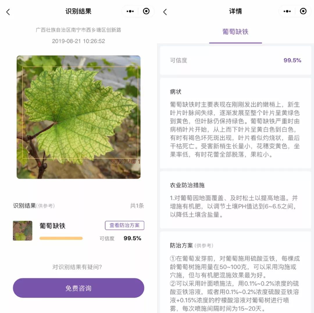 此外,葡萄園員工利用天潤智力人工智能應(yīng)用——耘眼(微信小程序/APP),只需要用手機拍攝葡萄的葉片、果實照片,就能進行病蟲害識別,從而獲得對應(yīng)的防治措施和用藥方案。目前,耘眼基于上萬張樣本量,能夠識別幾十種陽光玫瑰葡萄常見病蟲害,識別準確率達98%以上。