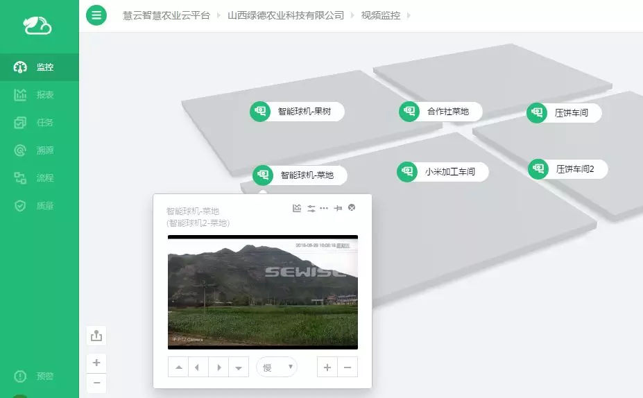 為了更好掌控農(nóng)產(chǎn)品種植以及加工過程,天潤智力在綠德農(nóng)業(yè)的野菜基地、火棘基地以及加工車間分別安裝了360度高清攝像頭,用戶可以隨時隨地直觀了解基地情況,對現(xiàn)場農(nóng)作物生長情況進行實時動態(tài)、靜態(tài)的監(jiān)控、記錄。用戶即便出門在外,也可以通過手機或者電腦登陸云平臺實時查看作物情況,指導(dǎo)員工開展種植與生產(chǎn)活動。農(nóng)業(yè)生產(chǎn)變得更加自由自主們更加高效便捷。