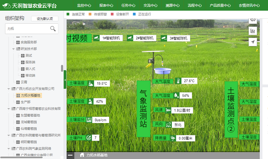 大的生態(tài)環(huán)境短期內(nèi)無法改變,若是想讓水稻達(dá)到自然有機(jī)的種植的標(biāo)準(zhǔn),必須通過水稻田間種植管理,改變局部種植環(huán)境來實(shí)現(xiàn)。2015年5月,廣西力拓農(nóng)業(yè)開發(fā)有限公司引進(jìn)天潤智力智慧農(nóng)業(yè)監(jiān)控系統(tǒng)及農(nóng)產(chǎn)品溯源系統(tǒng),實(shí)現(xiàn)對水稻田進(jìn)行溫度、濕度、土壤PH值等環(huán)境數(shù)據(jù)的實(shí)時監(jiān)測,以便在最合適的時機(jī)對稻田做最優(yōu)的管理方式,全程記錄水稻生長過程,實(shí)現(xiàn)水稻生產(chǎn)的全程可溯源。