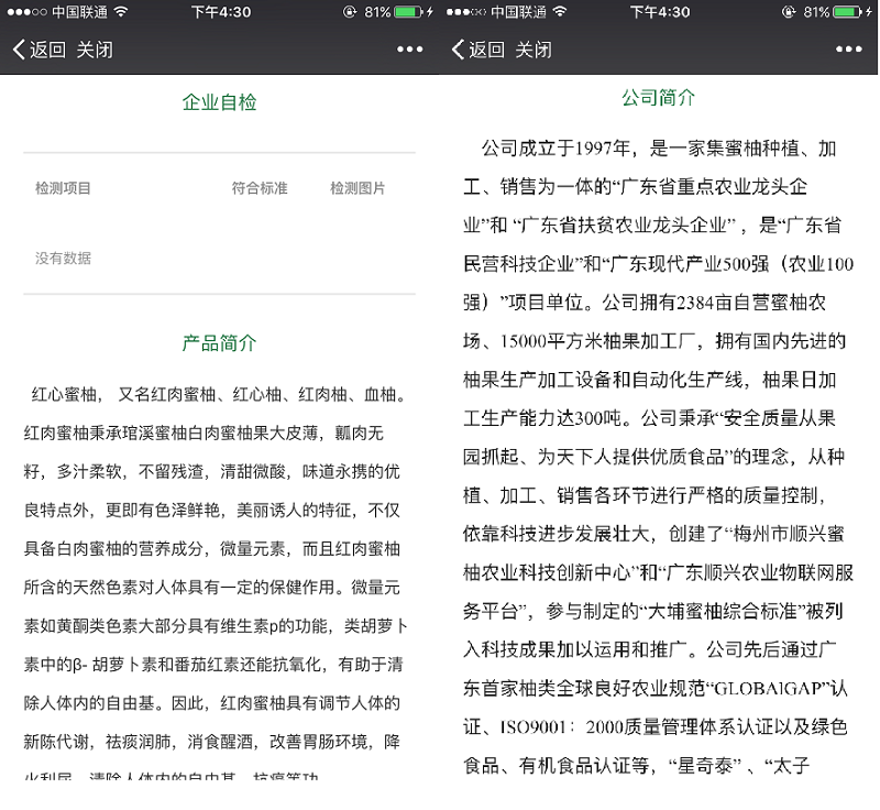 天潤智力農(nóng)產(chǎn)品溯源系統(tǒng),給廣東順興種養(yǎng)股份有限公司的每一批制作了唯一的身份(二維碼),完整記錄這蜜柚的品種、產(chǎn)地、種植、肥料使用、生長環(huán)境等全部信息,消費者只要掃描產(chǎn)品二維碼,就能快速地查看農(nóng)產(chǎn)品的詳細信息。廣東順興種養(yǎng)股份有限公司利用農(nóng)產(chǎn)品溯源平臺,在消費者心中,很好地展示了安全、優(yōu)質(zhì)的良好品牌形象。