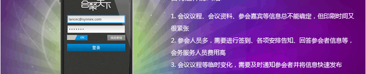 萬網(wǎng)新聚思手機(jī)應(yīng)用會(huì)議系統(tǒng),為會(huì)務(wù)、公關(guān)公司項(xiàng)目經(jīng)理或者公司會(huì)務(wù)組織者提供手機(jī)移動(dòng)應(yīng)用會(huì)議系統(tǒng),主要包括日程、嘉賓資料及時(shí)的會(huì)議更新。