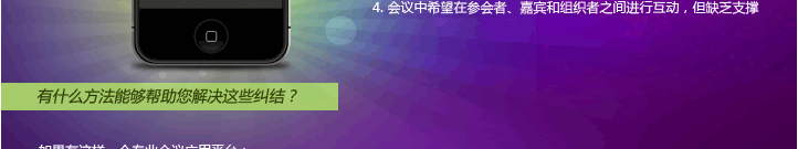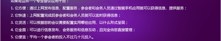 新聚思手機(jī)應(yīng)用會(huì)議系統(tǒng),為會(huì)務(wù)、公關(guān)公司項(xiàng)目經(jīng)理或者公司會(huì)務(wù)組織者提供手機(jī)移動(dòng)應(yīng)用會(huì)議系統(tǒng),主要包括日程、嘉賓資料及時(shí)的會(huì)議更新