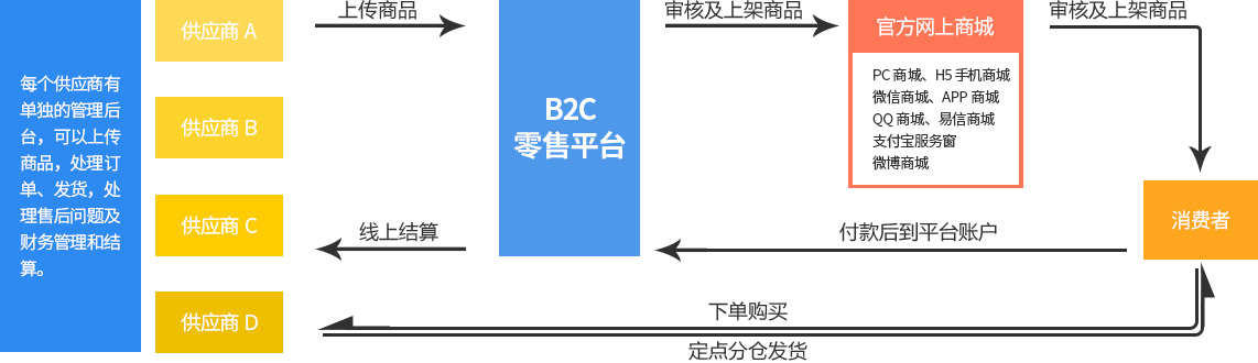 多供應(yīng)商零售電商解決方案,主要是幫助企業(yè)打通上游供應(yīng)鏈,整合已有的資源優(yōu)勢,結(jié)合線上全渠道銷售通道,構(gòu)建一個智能化的零售商業(yè)生態(tài)圈。0倉儲成本,定點(diǎn)發(fā)貨,是企業(yè)零售運(yùn)營的新模式。