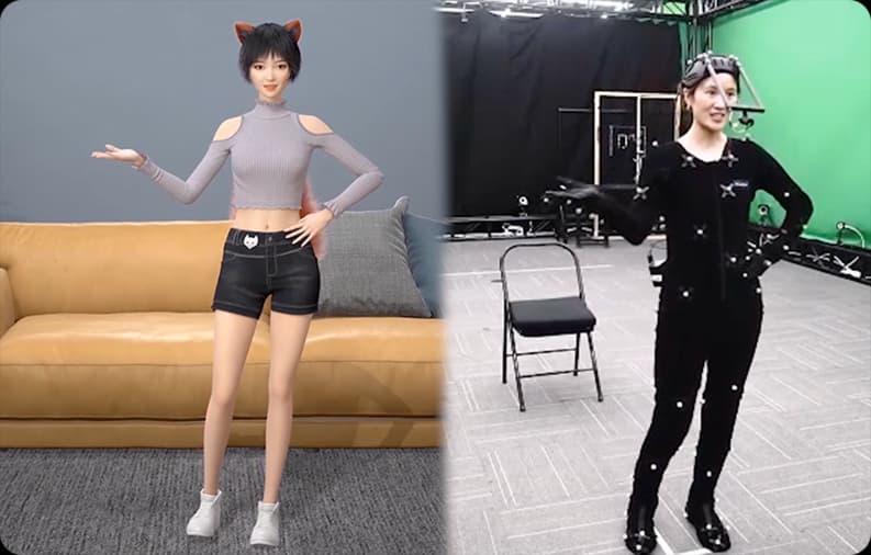 實時、高質(zhì)量捕捉演員(中之人)的動作、表情、手勢、眼神并通過三維人體運動重定向及表情遷移技術(shù),驅(qū)動各類元宇宙人物,實現(xiàn)元宇宙人物和用戶之間即時互動。