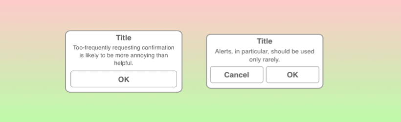 對話框是在使用者進行操作時強行介入的一種「模式」。在 App 中盡量不要使用警告框,也不要毫不思考地使用對話框。例如在 App 開啟時跳出的「新消息」警告框,或者只是告知使用者操作的結果的警告框等,都應該避免使用。