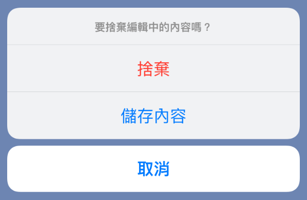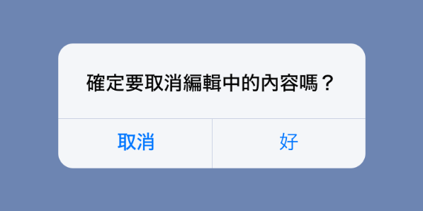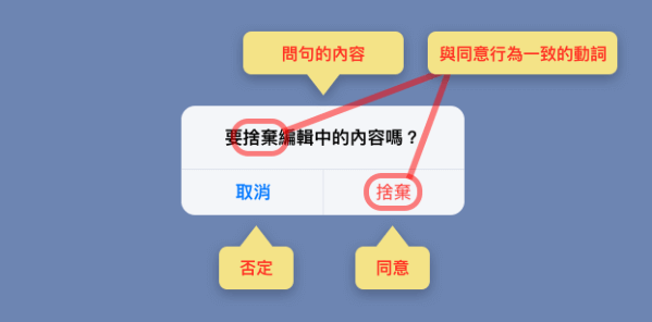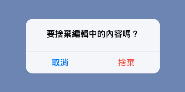 看過上面這些討論,我們可將這個警告框的說明文字中的「確定要取消編輯中的內(nèi)容嗎?」改寫成「要舍棄編輯中的內(nèi)容嗎?」
