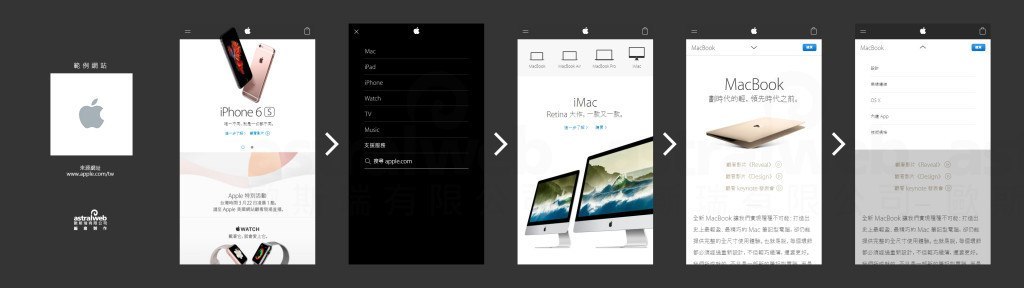 Apple選單使用跳頁(yè)方式呈現(xiàn),在選擇產(chǎn)品大分類后,進(jìn)入該類別的專頁(yè),不使用相同的選單樣式,而選擇使用橫式滑塊,并使用分類圖做搭配,在第三層產(chǎn)品介紹項(xiàng)目頁(yè)面中,使用第二階層下拉選單。他將每一層做區(qū)分,并針對(duì)每一層的不同需求,而對(duì)應(yīng)不同的選擇方式。