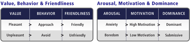 情緒的價(jià)值維度能夠影響我們的行為(即,趨近還是回避),而喚醒維度則影響我們做事情的動(dòng)機(jī)。情緒影響行為的不同方面,而隨著時(shí)間的推移人們會(huì)將情緒的表達(dá)知覺(jué)為不同的人格方面。價(jià)值影響友好性的知覺(jué),喚醒則影響支配性的知覺(jué)。