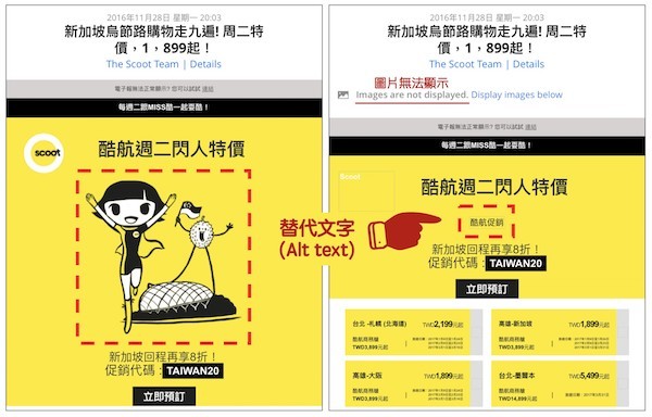 除此之外,替圖片加上替代文字(alt text)是一個(gè)設(shè)計(jì)電子郵件的好習(xí)慣,這種防御型設(shè)計(jì)可以讓電子郵件在圖片尚未顯示或是無法正確顯示的情況下,仍然維持一定程度的可讀性。