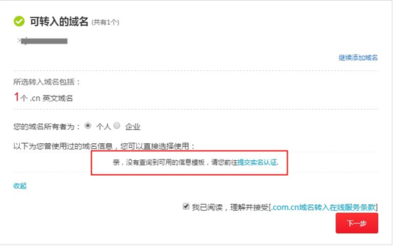 4、在進行域名轉(zhuǎn)入操作時,必須選擇一個“已實名認證”狀態(tài)的信息模板,才可提交 轉(zhuǎn)入并進行支付。