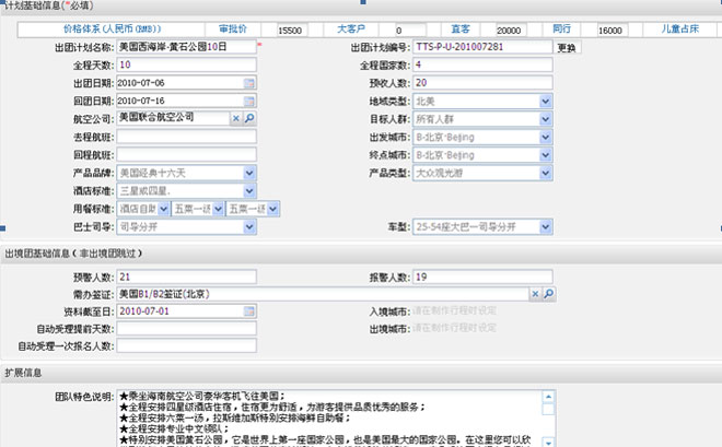 行程制作:制作散團(tuán)行程,細(xì)化到酒店、車、餐、導(dǎo)游、景點(diǎn)、節(jié)目、購(gòu)物等