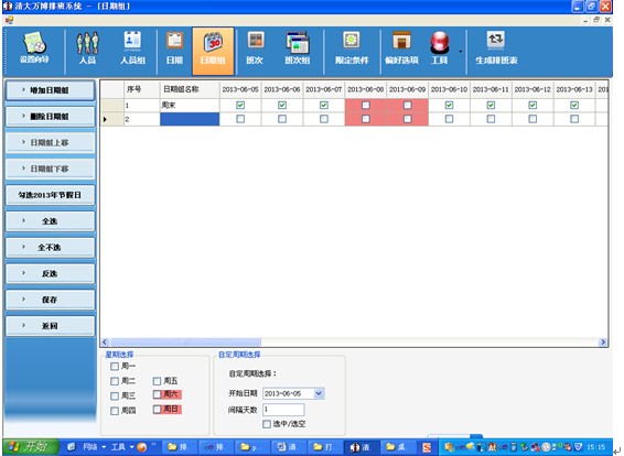 設定日期集合,可增加、修改、編輯勾選日期組成員,組成員間的復制粘貼,支持組成員的全選、反選、批量選擇等操作。支持星期選擇、周期選擇、節(jié)假日選擇等各種批量選擇。 |